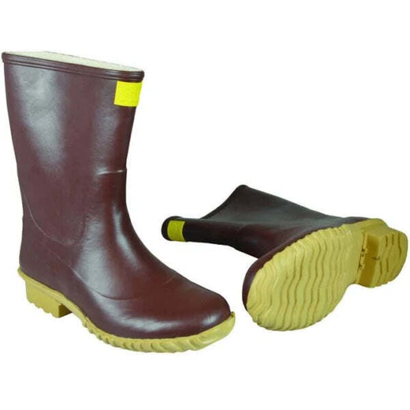 In PVC e gomma nitrilica. Con fodera in tessuto di cotone, suola carrarmato. Colore marrone. N. 42