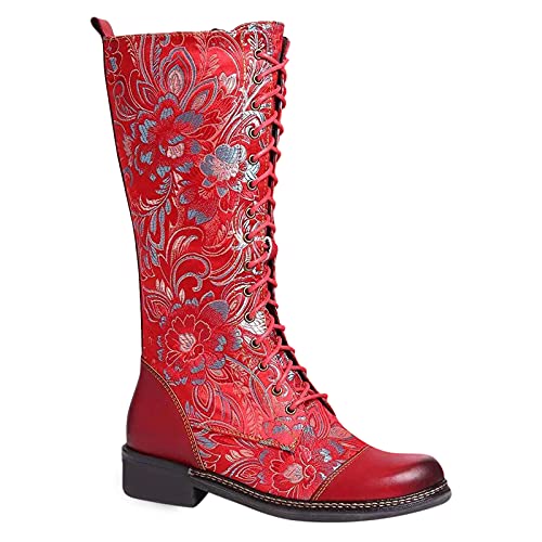 Stivali Vintage da Donna Ricamati Stivali da Moto Stivali da Donna Stile Etnico Stivali Lunghi Scarpe (42,Rosso)