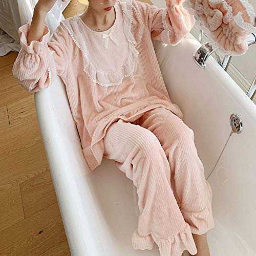 STJDM Camicia da Notte,Pigiama in Velluto a Righe da Donna Autunno Inverno Set Top in Pizzo + Pantaloni Lunghi Pigiama Vintage con Volant Set da Notte Caldo Loungewear M Rosa