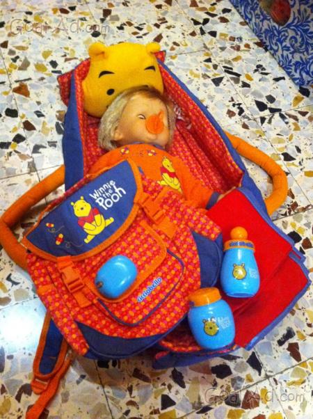 cicciobello winnie the pooh: zainetto con accessori, copertina, bambolotto, porta bimbo e cuscino, 35 €.