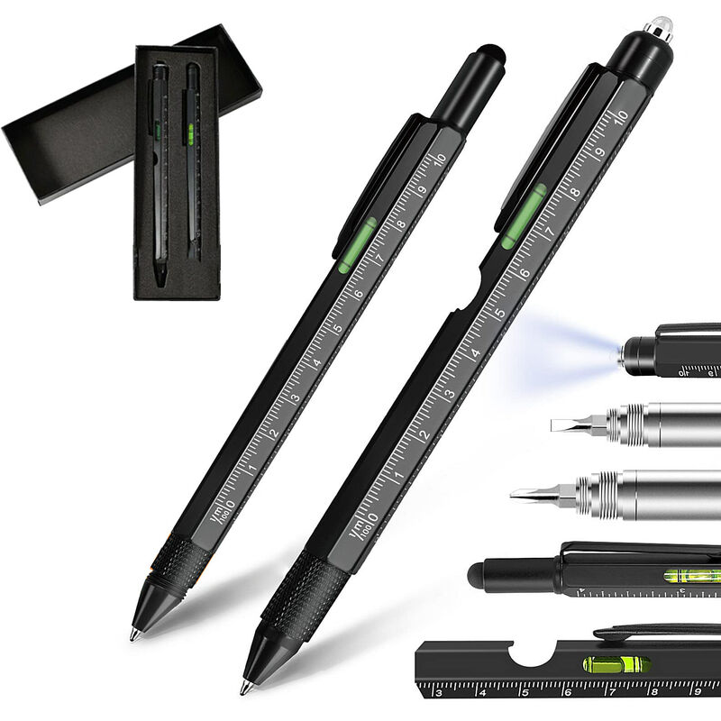 Specifiche. Nome del prodotto: penna multiutensile Colore: nero Materiale: barra di alluminio + raccordi in ottone Dimensioni: 11 x 165 mm / 0,4 x 6,5 pollici Caratteristiche: livella, touch screen, cacciavite Phillips, cacciavite a testa piatta, scala graduata (2 scale), biro, luce LED, apribottiglie. Caratteristiche: 9 -in-1, antiscivolo, multifunzionale, design a clip Applicazioni: edilizia, ingegneri, falegnami, falegnami, tuttofare, ecc. Lista di imballaggio. 1x P248 Penna multi-strumento 1x P136A Penna multi-strumento 1x custodia rigida