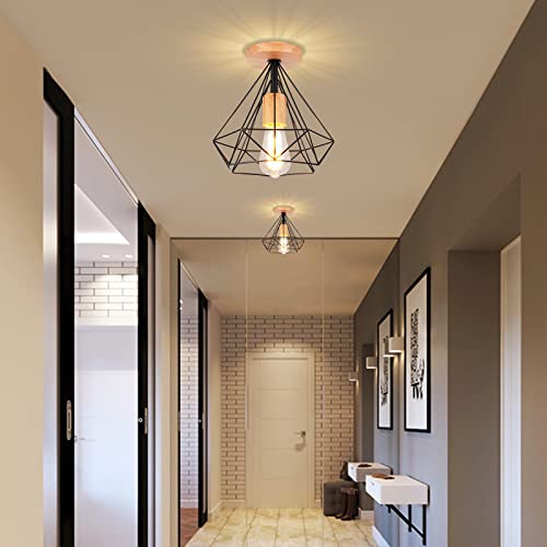 STOEX Plafoniera Vintage Industriale Design Legno e Metallo Gabbia Forma Diamante 25CM E27 LED Apparecchio Illuminazione per Soggiorno Cucina Camera Deco (2pcs Nero con Legno)