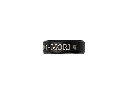 Acciaio inossidabile: l'anello è realizzato in acciaio inossidabile e presenta un rivestimento nero. I bordi sono di colore più lucido, mentre la fascia centrale dell'anello è nera opaca. È qui che le parole "Memento Mori" e teschi sono state incise al laser.