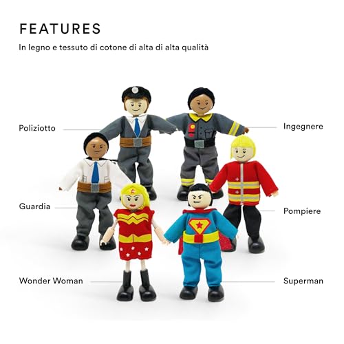 Stokke MuTable Heroes Set by Hape Toys - Sei bambole per la Casa degli eroi, fra cui, il Pompiere, il Poliziotto, l'Ingegnere, la Guardia e due Supereroi - In legno e cotone - Per bambini dai 3 anni