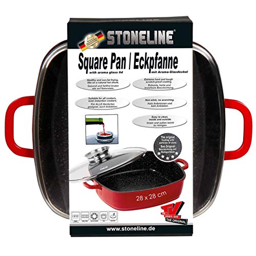 STONELINE 13896 - Casseruola Quadrata in Alluminio pressofuso con Rivestimento Antiaderente, Coperchio Salva Aroma in Vetro e 2 presine termoisolanti, Anche per induzione, 28 x 28 cm, Colore: Rosso