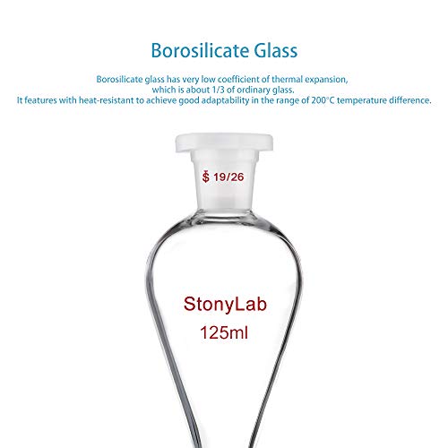 StonyLab Imbuto Separatore Conico da 125ml in Vetro Borosilicato Pesante con Giunti 19/26 e Rubinetto di Chiusura in PTFE Conical Separatory Funnel - 125ml