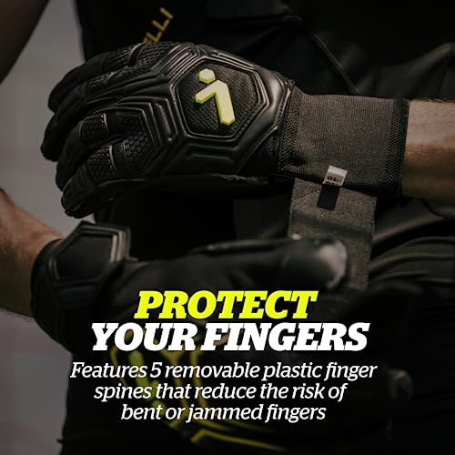 Dita personalizzabili e presa superiore: il taglio negativo con i pollici in rotolo (rivestimento in lattice extra) garantisce una presa superiore della palla. Le spine ergonomiche in plastica rimovibili evitano inceppamenti delle dita e curve all'indietro consentendo un comfort personalizzabile.