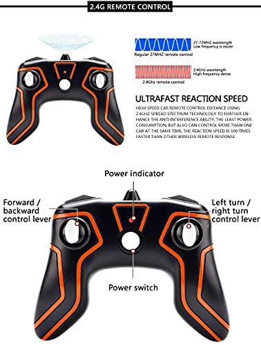 「Batteria ricaricabile incorporata」 - Questa macchine telecomandate bambini ha una batteria ricaricabile incorporata, quindi puoi utilizzarla in bicicletta. La batteria e il caricabatterie extra possono farti tornare al divertimento delle corse automobilistiche veloci giocattolo con telecomando ancora e ancora.