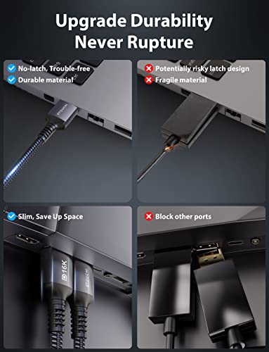 【Affidabile capacità anti-interferenza】: cavo DisplayPort 2.1 Stouchi 16K realizzato in rame stagnato 28AWG con schermatura a triplo strato per trasferire segnali video e audio stabili. La giacca intrecciata in nylon di qualità con una durata di 30000+ di piegatura offre un cavo DisplayPort a DisplayPort resistente. I connettori placcati in oro 24K non si ossidano o diminuiscono la conduttività nel tempo