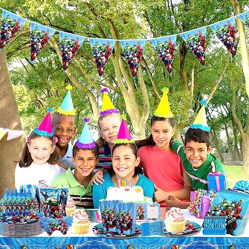 104 pcs Stoviglie di Compleanno Set,Set di stoviglie per Feste,Decorazioni di Compleanno per Bambini,Tovaglioli,Piatti,Tovaglie,Cannucce,Gagliardetti (blu-a)