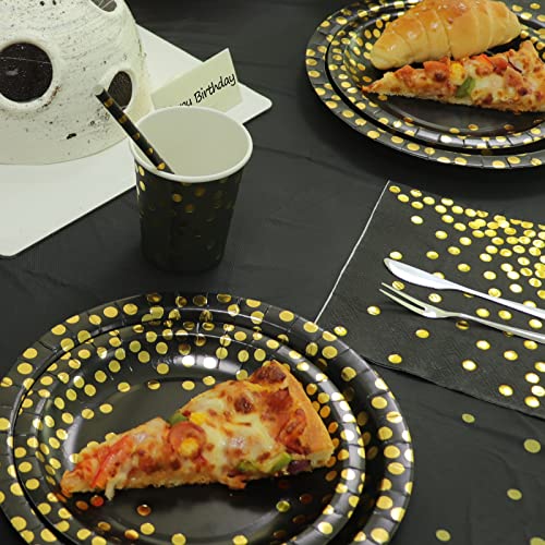 Stoviglie per Feste 127 Pezzi Stoviglie Carta Set Include Piatti di Carta Tovaglioli Tazze Tovaglia Banner, per Compleanno Anniversario Cocktail Party Matrimonio Laurea (25 Ospiti - Nere e Dorate)
