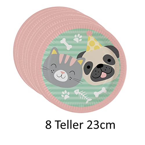 Il set di stoviglie da 36 pezzi per gli amanti dei gatti e dei cani è composto da: 8 piatti usa e getta con motivo animali domestici, in cartone, colore rosa, dimensioni 23 cm