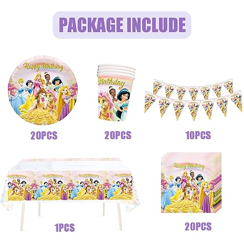 【Set da tavola per 20 ospiti】Il set da 62 pezzi include 20 piatti da dessert da 7 pollici, 20 tovaglioli, 20 tazze, 1 striscione, 1 tovaglia. Fornisce stoviglie sufficienti per 20 invitati alla festa a tema principesse.