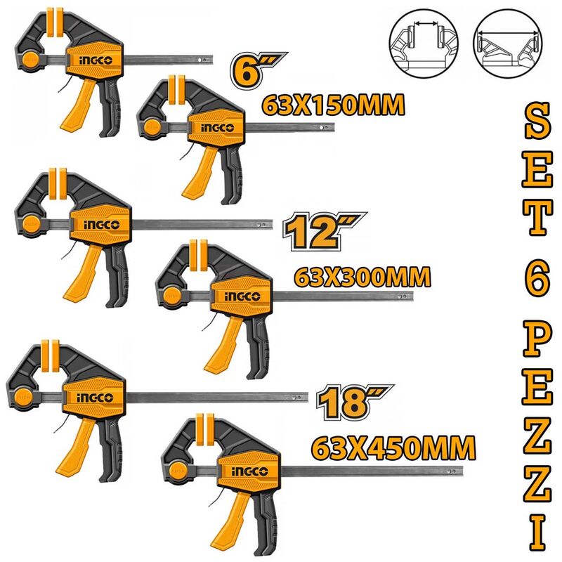 Set di strettoi a sgancio rapido professionali reversibili da 6 pezzi con morsetti larghi 63 mm e lunghi rispettivamente 150, 300 e 450 mm. Pezzi inclusi nel set: N. 2 Ingco HQBC01601 Dimensioni morsetto: 63x150mm Forza massima di bloccaggio: 60kg Spessore e larghezza del righello di ferro: 5X18mm N. 2 Ingco HQBC01602 Dimensioni morsetto: 63x300mm Forza massima di bloccaggio: 60kg Spessore e larghezza del righello di ferro: 5X18mm N. 2 Ingco HQBC01603 Dimensioni morsetto: 63x450 mm Forza massima di serraggio: 60kg Spessore e larghezza del righello di ferro: 5X18mm