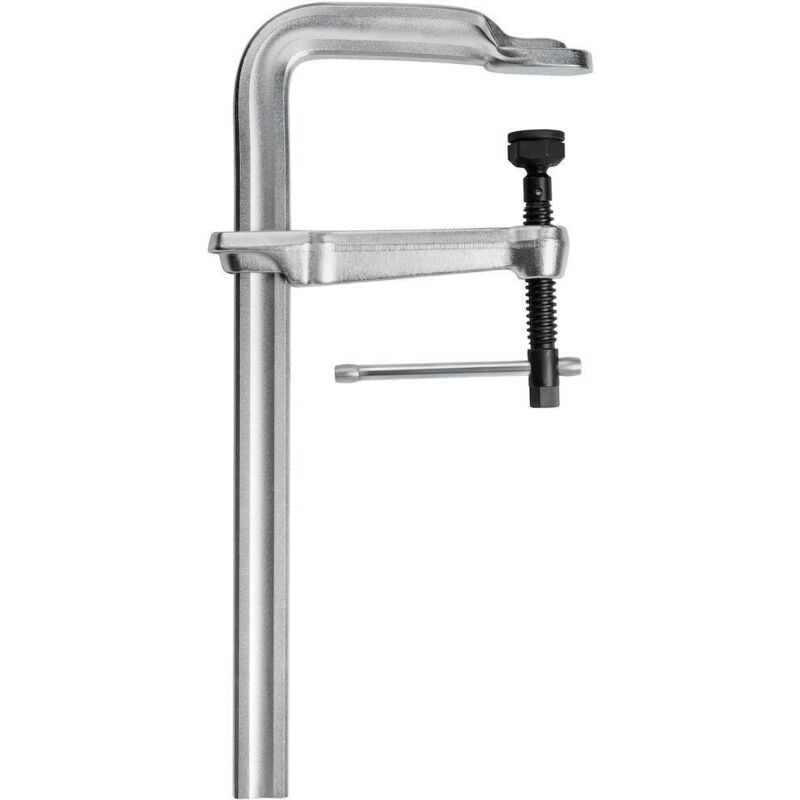 Guida e arco fisso in acciaio lucido trafilato (profilato speciale), bonificato e zincato galvanicamente. Arco scorrevole in acciaio forgiato, bonificato e zincato galvanicamente. Mandrino scorrevole in acciaio e resistente all'usura con filettatura trapezoidale. Lunga durata grazie allo speciale piattello di pressione resistente al calore con inserto in acciaio sinterizzato. Asta filettata bonificata e brunita con galletto regolabile. Orientabile fino a 35°. Uso: Per sollecitazioni elevate nel serraggio di pezzi in carpenteria, officine di fabbri, costruzioni di autocarri, ingegneria meccanica, ecc. Il cappuccio a pressione speciale orientabile consente il serraggio di pezzi inclinati. Pressione di serraggio massima fino a ca. 22000 N. Dati tecnici Tipo di prodotto Strettoio Profondità arco, mm 175 Apertura, mm 800 Sezione trasversale della guida, mm 40×20 Peso, kg 8,4