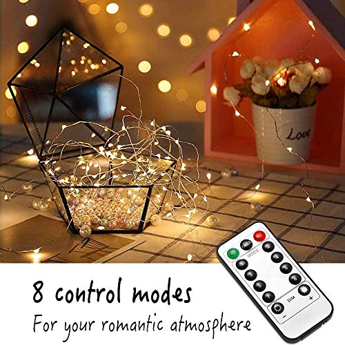 Stringa Led Batteria 2 Pezzi Filo Rame Ghirlanda Luminosa 10 m 100 LED Mini led Luci 8 Mode Filo Luci Led Timer Impermeabile IP66 Micro Luci Led Natale Con Telecomando per Balcone,Camera,Bianco Caldo