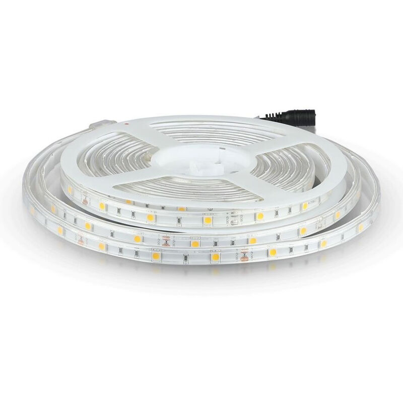 La striscia è composta da 30 LED per metro, dispone di un fascio luminoso di 120° mentre il flusso luminoso è di circa 16 lm per LED. Ha una potenza di 6W al metro ed un rapporto di 83 lm/W. La striscia ha un grado di protezione IP65 ed è impermeabile. Tramite i cavi a saldare può essere facilmente connessa all'alimentatore o ad un'altra strisci LED. Nella confezione è presente anche un connettore a 2 poli per collegare 2 strisce LED in modo ancora più semplice. E' divisibile ogni 3 led ed è dotata di striscia adesiva sul retro. Tipo di led SMD5050 Durata media >20000 ore Potenza 6W / metro Tensione 12 Vdc Angolo di illuminazione 120° Colore della luce Bianco caldo Temperatura di colore 3000K Flusso luminoso 500 lm / metro Numero di led 30 / metro Indice di resa cromatica >80 Valutazione IP IP65 Divisibile Ogni 3 LED, lungo i segni di taglio Larghezza 10 mm Classe di efficienza energetica G EAN 3800157691390 Modello 212145 VT-5050 Marca V-TAC Codice prodotto 02.181.0020008