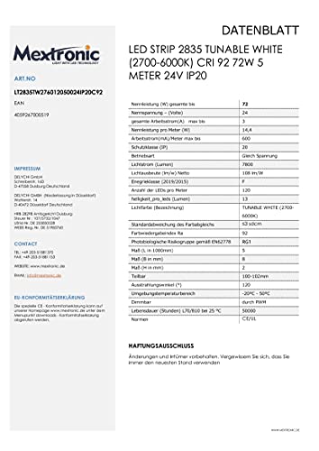 Striscia LED 2835 Tunable White (2700-6000K) CRI 92 72W 5m 24V IP20