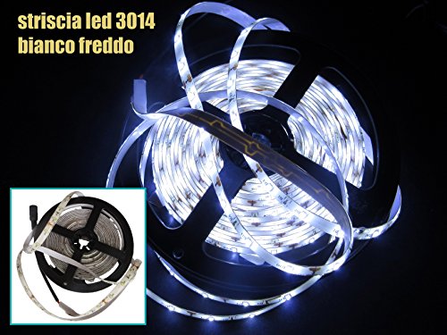 Striscia 5mt. 300led 3014 DC 12V colore bianco freddo 6000-6500k mm.8 impermeabile 18watt con connettore femm. 5,5/2,1