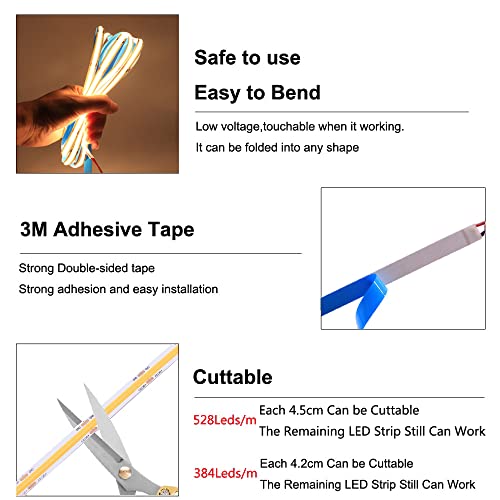 Super luminoso: la tecnologia COB consente una densità di imballaggio molto più alta della matrice LED, nessun punto scuro, minore potenza, maggiore efficienza luminosa (110LM/W), più alta CRI (80+), la striscia luminosa del LED COB è uniforme e morbida con buon effetto. Senza raggi ultravioletti e infrarossi, comodi e morbidi, innocui per i tuoi occhi.