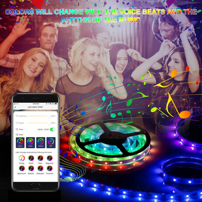 ?Connessione wireless? I LED sono controllati non solo tramite telecomando, ma anche tramite Bluetooth. Compatibile con tutti i sistemi operativi mobili (Android e iOS). Un'applicazione facile da usare. Utilizzare su smartphone per modificare i colori e gli effetti di luce. La portata del telecomando è di 8 metri. ?Funzione timer e sincronizzazione con la musica?Il colore della luce attraverso la banda LED Bluetooth può cambiare il ritmo o la melodia in base al rumore circostante con il suo microfono al momento. alta sensibilità. Altre modalità di illuminazione che puoi scegliere come Blinking, Breathing, Strobe, Gradient, Cool. Il timer consente di accendere e spegnere la striscia luminosa in qualsiasi momento. tempi predefiniti. ?Taglio e design fai da te? Puoi sempre tagliare lungo i tagli della fascia luminosa. diodi emettitori di luce. Il design ritagliato ti consente di decorarlo dove preferisci. Tu vuoi. Segui la tua immaginazione e idea;