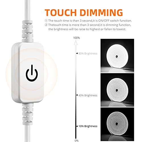 Alimentatore di rete e interruttori touch dimmerabili: la striscia LED viene fornita con un alimentatore di rete e un interruttore touch dimmerabile per regolare la luminosità, dimmerabile a chiaro, premere brevemente per accendere/spegnere. Il dimmer migliorato può essere regolato a piacimento dal 10% al 100% di luminosità senza disturbare i passaggi per resettare il telecomando.