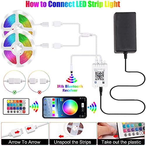♫【Set di Strisce LED Umanizzate da 10 m】Un rotolo di strisce LED autoadesive da 10 m, telecomando Blutooth, ricevitore, puoi regolare facilmente la luminosità, cambiare colore, accendere/spegnere le luci. Nota: le strisce LED non sono impermeabili e possono solo essere utilizzato all'interno.