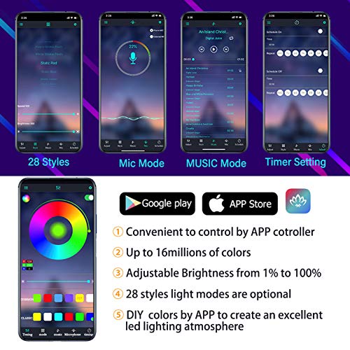 Controllo app e 16 milioni di colori: la striscia luminosa per interni dell'auto utilizza l'app wireless "Lotus Lantern" per il controllo adatta per iOS o Android. 29 modalità preimpostate integrate, controllo APP per accendere o spegnere le luci, abbassare o illuminare e persino regolare la velocità della modalità, personalizzare lo spazio interno dell'auto.