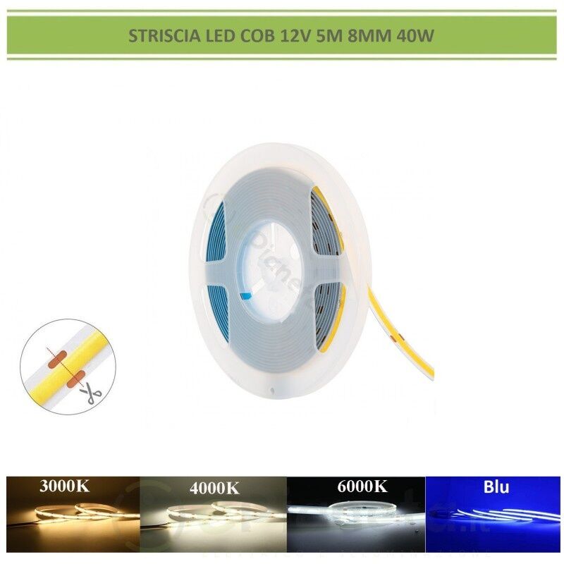 Striscia led dotata di illuminazione cob che permette di creare una luce continua e omogenea evitando l'antiestetico effetto puntinato dei led. Prodotto professionale di alta luminosità, dimmerabile e facile da installare poiché munita di adesivo. Caratteristiche Tipo di led cob Potenza 40w Tensione di uscita 12V Dimmerabile si Flusso luminoso / mt 700lm Fascio luminoso 180° Taglio (lungo i segni di taglio) ogni 4,5cm Grado di protezione IP20 Tempo di innesco 0.1 secondi Dimensioni Lunghezza 5mt Larghezza 8mm Luce disponibile Fredda bianca 6500k Naturale 4000k Calda 3000k Blu