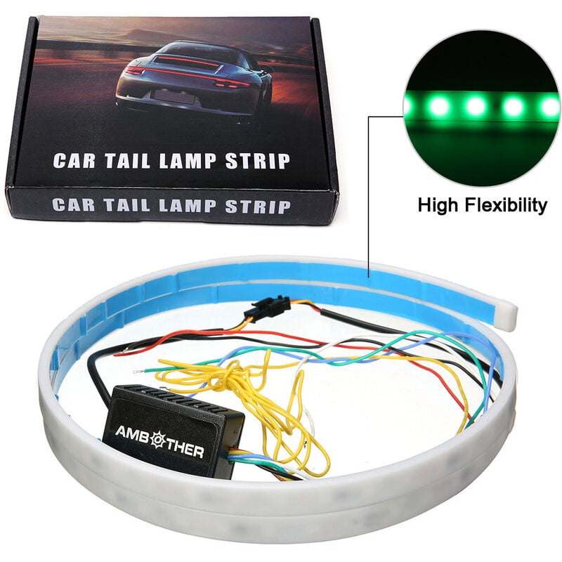 AMBOTHER Striscia luminosa universale per portellone posteriore per auto a LED, Freno scorrevole, Indicatore di direzione posteriore, Barra luminosa di emergenza con multicolore, Impermeabile, Flessibile, Multifunzione, DC 12V Guida per la maggior parte delle auto Caratteristiche: -Condizione: 100% nuovo. -Installazione semplice. Nastro autoadesivo incluso. -Impermeabile. -4 modalità di flash: freno, corsa, lampeggiante, luci di emergenza (doppio flash). -L'indicatore LED rimane rosso durante la frenata. - />-La luce LED rimane blu ghiaccio durante il normale funzionamento. -La luce LED scorre da sinistra a destra quando l'auto gira a sinistra e da destra a sinistra quando l'auto gira a destra.-La luce LED scorre dal centro alle estremità quando si utilizza la luce di emergenza (doppio flash). -Dimensioni: ca. L*L*P: 47''*0.4''*0.2'' -Colore LED: multicolore Istruzioni di cablaggio: Cavo rosso-ACC o 12V Positivo alimentazione CC + Cavo di terra nero o negativo alimentazione CC