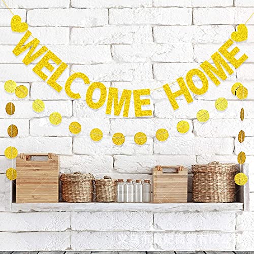 Striscione di carta glitter oro: 11 lettere BENVENUTO HOME + 1 grande cuore d'amore + 2 cuori piccoli + 3 m di nastro d'oro da appendere + 25 pezzi di ghirlande decorative rotonde in oro con 2 m di nastro di cotone bianco