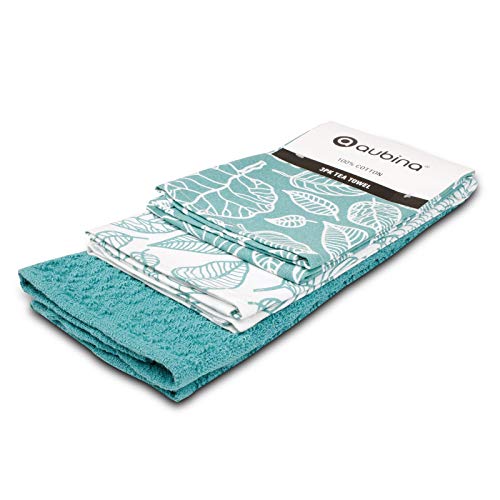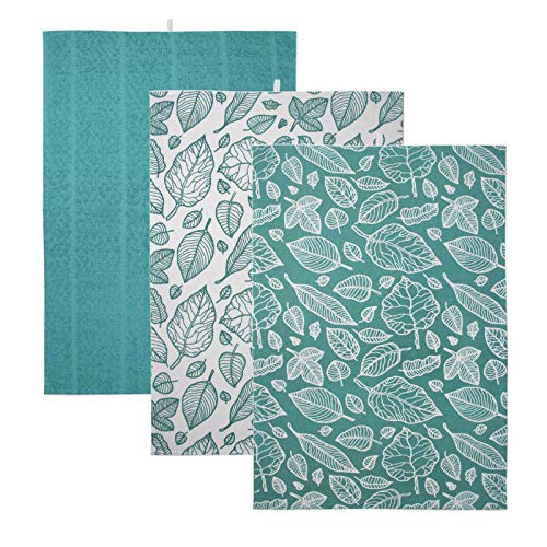 Set di 3 strofinacci da cucina, 100% cotone, assorbenti, 2 con design moderno con stampa a foglie e un asciugamano in spugna tinta unita, 3 pezzi Mint