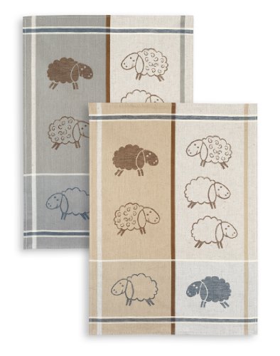 Set di 2 strofinacci in Jacquard, mod. KRACHT, mezzo lino, motivo: pecore, beige/grigio, formato 50 x 70 cm