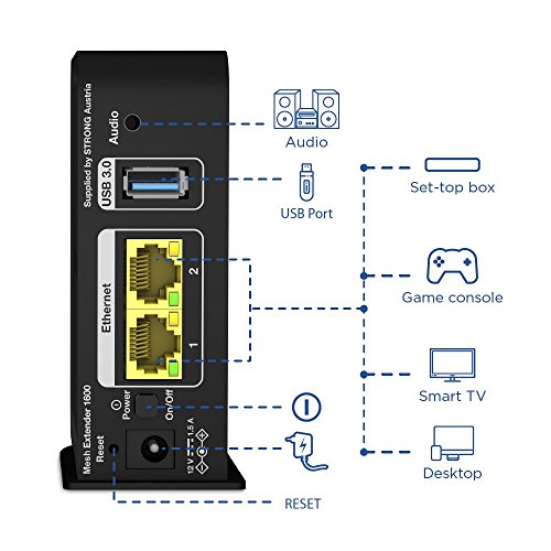 Extender 1600 può anche essere configurato come outstanding 802.11ac dual band Punto di accesso per migliorare immediatamente il wifi del tuo esistente modem single band cambiando il tuo modem. Extender 1600 è la base di STRONG MESH wifi solution 1600. Connetti 4 Extender 1600 assieme per coprire oltre 300 m² in piani multipli con un wifi che funziona semplicemente!
