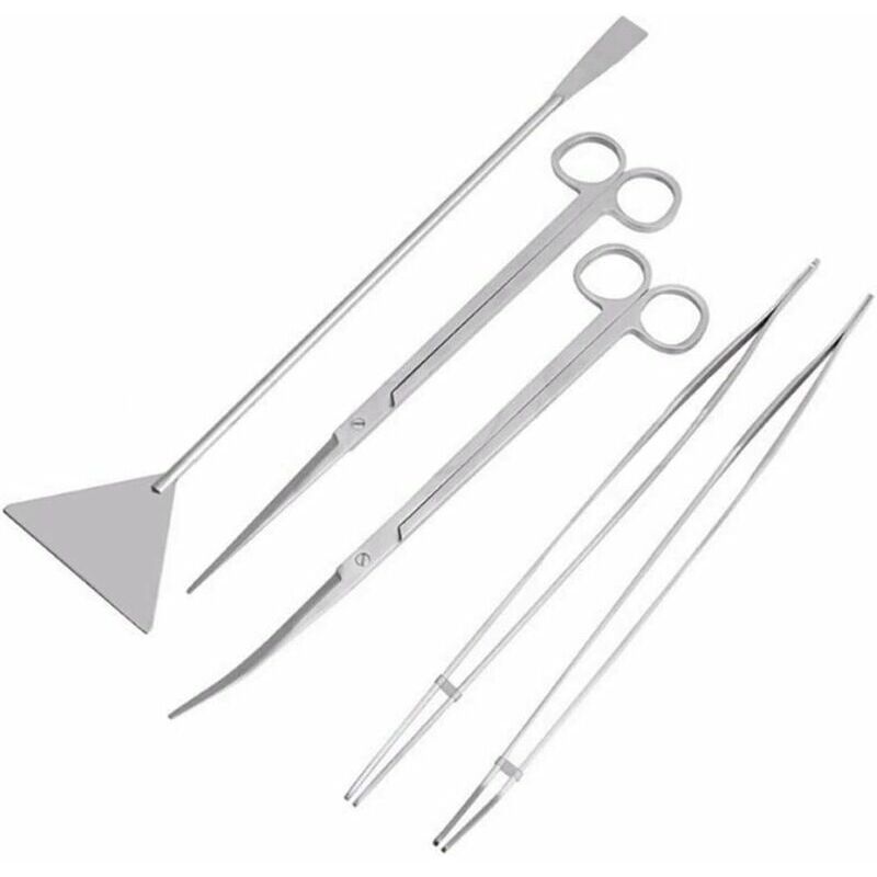Realizzato in acciaio inossidabile forgiato con eccellente flessibilità e resistenza alla ruggine. Le forbici sono affilate e sicure, quindi non si allentano o diventano opache. La curva degli strumenti raggiungerà aree difficili da raggiungere per piantare le piante dell'acquario. Punta delicata appositamente studiata per non danneggiare le vostre piccole piante acquatiche. Set di 5 attrezzi per Aquascaping acquario: forbici dritte, forbici curve, spatola per substrato, pinzette dritte, pinzette curve.