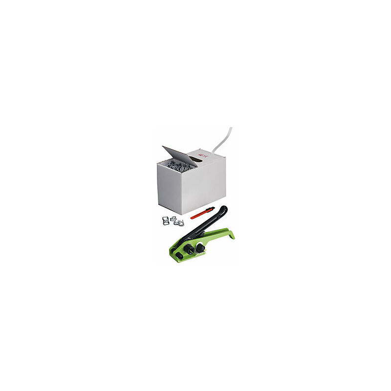 Set per reggiatura, reggia resistente in PET incollata, tendireggia, reggia in dispenser di cartone, ganci metallici, taglierina, larghezza reggia 16 mm. Fornitura = montato. Materiale reggia = reggia resistente in PET, incollata. Fornitura = tendireggia, dispenser in cartone, ganci metallici, taglierina. Larghezza reggia = 16 mm. Campo d'applicazione = prodotti pesanti, prodotti fragili, prodotti ingombranti. Durata di impiego = stoccaggio a lungo termine. Luogo d'impiego = per interni ed esterni. Resistenza alla trazione = 450 kg. Chiusura = ganci metallici. Lunghezza reggia = 200 m. Versione svolgitore = dispenser in cartone con nastro. Tipo di prodotto = set per reggiatura. Il set è composto da - Tendireggia per reggia larga 13 - 19 mm - 1 bobina di reggia resistente in poliestere, incollata, in dispenser di cartone - Ganci metallici, confezione da 100 pezzi da 13 mm o 80 pezzi da 16 mm - 1 taglierina Tutti i componenti sono disponibili singolarmente per ordini successivi. Su
