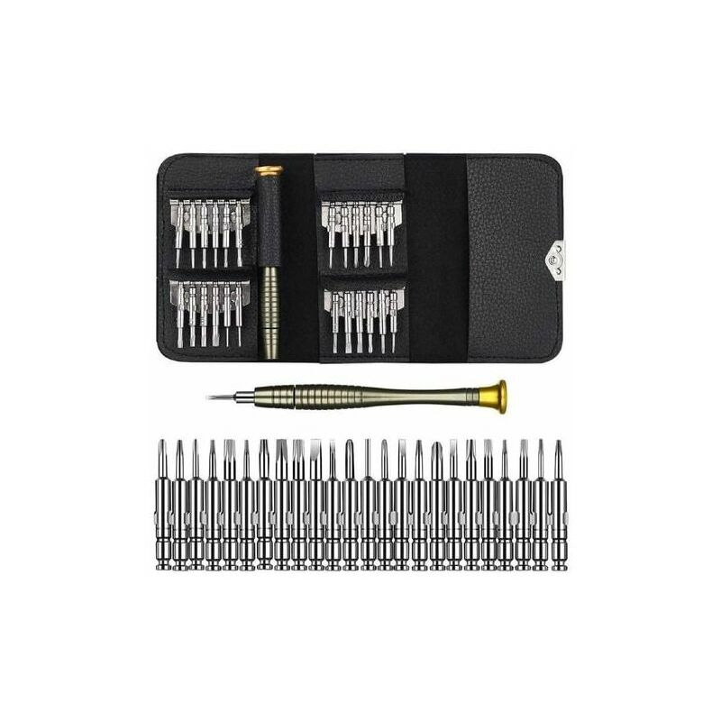 Cacciavite di precisione 25 in 1 inclusi: Pentalobe, Torx, Phillips, piccole viti per telefoni cellulari, riparazione occhi, riparazione occhiali, tablet PC, lettore MP3, riparazione Macbook e hobbista. < p>Il set di cacciaviti di precisione in acciaio al cromo vanadio viene fornito con 1 custodia in pelle a clip per tenere tutti gli strumenti al sicuro ed è abbastanza piccolo da poter essere portato con te ovunque o riposto ovunque. Facile da usare: l'assemblaggio delle diverse punte si fa svitando il corpo del cacciavite e poi posizionando la punta. Una volta in posizione, non si sposta. Kit di cacciaviti per tutti i piccoli lavori di riparazione in casa, gamma di PC, laptop ed elettronica, telefono cellulare ecc., ideale per modellismo, lavori di costruzione fai-da-te costruzione, per riparare orologi e tracciare lunette.