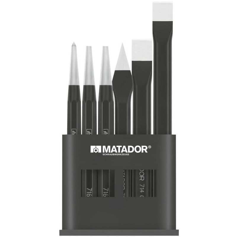 Set di strumenti Scioccipelli piatti, scalpelli a croce, cereali e conducenti in una serie di materiale: Speciale Surface in acciaio conducente in aria vanadio cromata: scalpello piatto laccato nero, scalpelli a croce, cereali e conducenti in un set molto elevato attraverso la speciale aria cromata-vanadio. Acciaio indurente per scavalcare o affondare elementi di collegamento come rivetti, penne o bulloni, per la marcatura di punti di perforazione su superfici metalliche, per dare un pugno al foglio di speciale indure di aria del vanadio cromatico in acciaio / nero dipinto di verniciatura 645 Contenuto Codella C ogni 1x Pik 0715 0714 125, 150 mm pik 0715 125 mm pik 0715 0716 3, 4 mm pik 0715 0717 4 mm