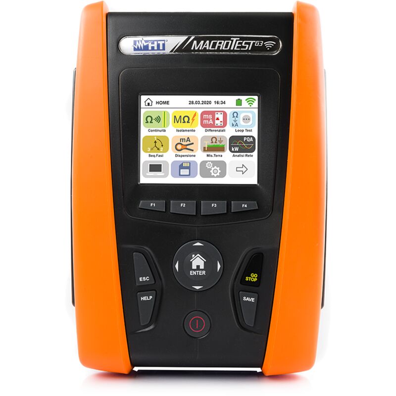 Strumento Multifunzione HT MACROTESTG3PER per la verifica della sicurezza elettrica degli impianti elettrici civili e industriali: Tutte le verifiche sulla sicurezza elettrica previste dalle norme CEI 64-8. Advanced Loop Verifica delle protezioni magnetotermiche, fusibili e dimensionamento dei cavi Resistenza di Terra con metodo voltamperometrico a 2 o 3 punti nei sistemi TT, TN e IT, misura di resistenza globale di terra e con pinza amperometrica T2100 (opzionale) Resistività del terreno Misura dei parametri elettrici in installazioni Monofase (V,A, W, VAR, VA, PF) Prova Differenziali tipo A, AC, B fino a 1A, anche con toroide separato con corrente di prova fino 10A (con accessorio opzionale RCDX10) Misura della resistenza di isolamento Misura di continuità dei conduttori di protezione Verifica senso ciclico delle fasi (SEQ) e correnti disperse Misura dei parametri ambientali tramite sonde esterne. MacrotestG3 è uno strumento rivoluzionario. Il display a colori TFT con touch-screen