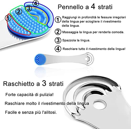 [Versione aggiornata 2021 - Raschietto per lingua 2 in 1] Un'estremità è un raschietto per lingua in metallo, l'altra estremità è un pennello per raschietto in silicone, può essere più efficiente e multidirezionale per pulire la lingua, eliminare l'alitosi e mantenere una migliore igiene orale .