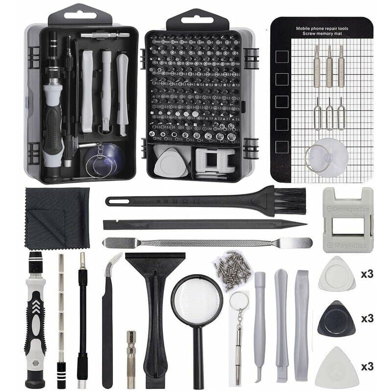 1 Caratteristiche della scatola: Kit di cacciaviti 136 in 1: il set di cacciaviti multifunzione è composto da 104 punte per cacciavite sostituibili e 32 accessori di smontaggio, che soddisfano le tue esigenze nei lavori di riparazione quotidiani. Design di archiviazione: la posizione del kit di strumenti ha un design professionale dello slot per schede e un ragionevole ordine dei fori, che ti aiuta a trovare rapidamente il bersaglio. Impugnatura in silicone antiscivolo: l'impugnatura ha un design antiscivolo