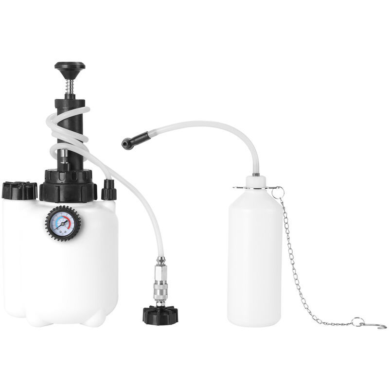 Questo spurgo del sistema frenante automatico è realizzato in materiale di qualità, la grande capacità di 3 litri viene fornita anche con una bottiglia di aspirazione da 1 litro. Non solo facile da lavare, ma anche pratico e facilita lo spurgo dei freni su un'ampia varietà di tipi di veicoli. Dotato di manometro colorato e i dati sono facili da leggere. Ci sono due unità sul manometro, bar (0-6) e psi (0-85). Puoi provare. Note: Assicurati che non rimanga alcuna pressione all'interno dell'unità. La pressione può essere rilasciata dalla valvola di rilascio sul lato della pompa. Rimuovere il tappo sul lato superiore dell'unità con un nuovo liquido dei freni. Assicurarsi che non vi siano residui di vecchio liquido o detriti nella tanica. Specifiche: Nome: kit spurgo freni Materiale: plastica Colore: bianco Pressione: 0-85 PSI (0-6 bar) Capacità spurgo freni: 3L Dimensione articolo: < br /> Spurgo freni: 180 * 175 * 40 mm / 7,09 * 6,89 * 1,57 pollici Lattina da 1 litro: 225 * 85 * 85 mm