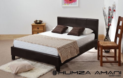 Struttura letto matrimoniale in legno robusto, con rivestimento in pelle sintetica marrone di alta qualità.
