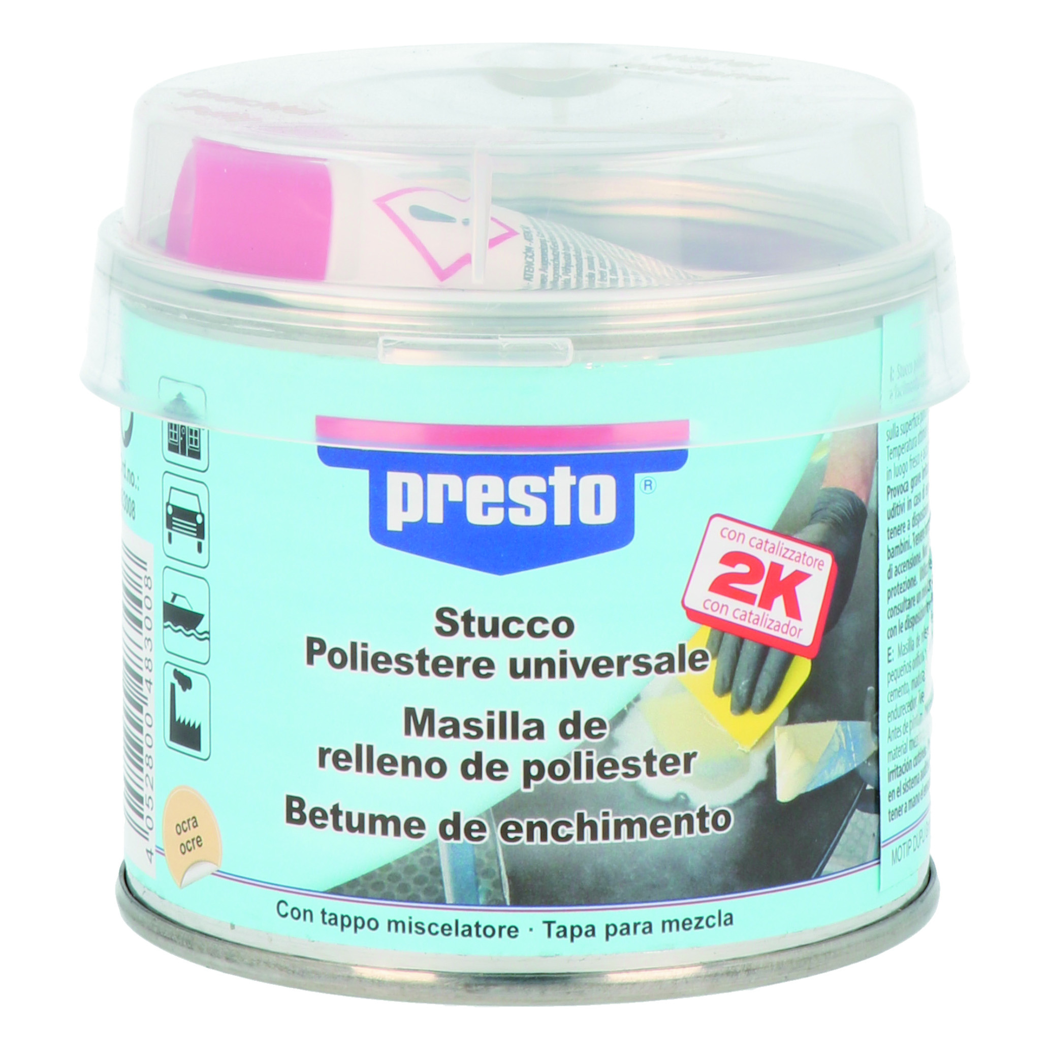 Bicomponente riempitivo e spatolabile costituito da una miscela di resina poliestere medio-elastica miscelabile ad un catalizzatore. Adatto per applicazioni su metallo, legno, calcestruzzo.. Ideale per riempire buchi e irregolarità, sovrastuccare superfici pretrattate e superfici metalliche ed in legno.. Riempie buchi e irregolarità. Senza amianto nè silicone. Resiste a acidi, basi, carburanti, solventi, acqua e sali antigelo