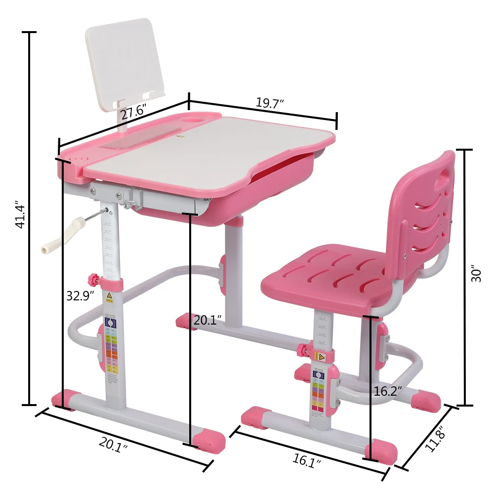Kid Study Desk And Chair 80cm Hand-Operated Lifting Table Top Can Tilt Children Learning Table And Chair Pink With Reading Frame