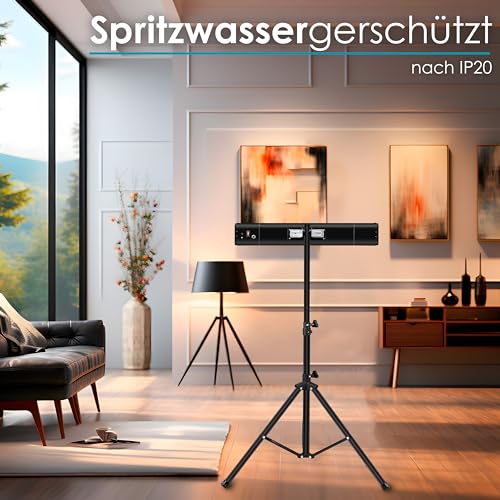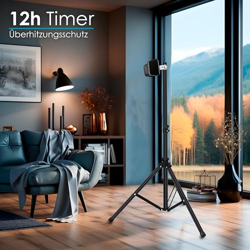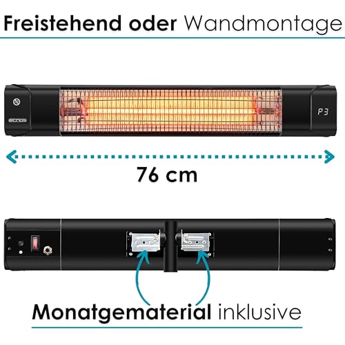 Caratteristiche principali: 3 livelli di potenza: 500, 100 o 1500 Watt (regolabile), display timer 12 ore, telecomando resistente agli spruzzi d'acqua secondo IP20, protezione da surriscaldamento, altezza regolabile: 120 - 180 cm, angolo di inclinazione regolabile: 0-45°, autoportante o montaggio a parete (materiale di montaggio incluso nella confezione)