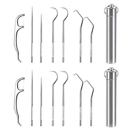 Set di 14 stuzzicadenti in acciaio inox, portatile, in titanio, riutilizzabili, impermeabili, in metallo, per rimuovere macchie dentali, strumento per dentisti
