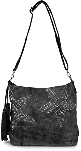 StyleBREAKER Borsa di Jeans con stelle e applicazioni di strass in un aspetto vintage, borsa a tracolla, donna 02012035, colore:Grigio scuro-Nero