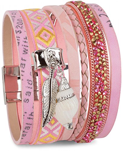 StyleBREAKER bracciale con pendente in piuma e conchiglia, pietre strass, tessuto etnico, stampa, chiusura magnetica, da donna 05040044