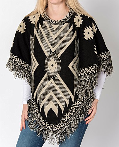 StyleBREAKER Poncho in Maglia con Motivo Azteco, Motivo Inca e Frange, Girocollo, Maglia fine, Donna 08010011, Colore:Nero-Beige